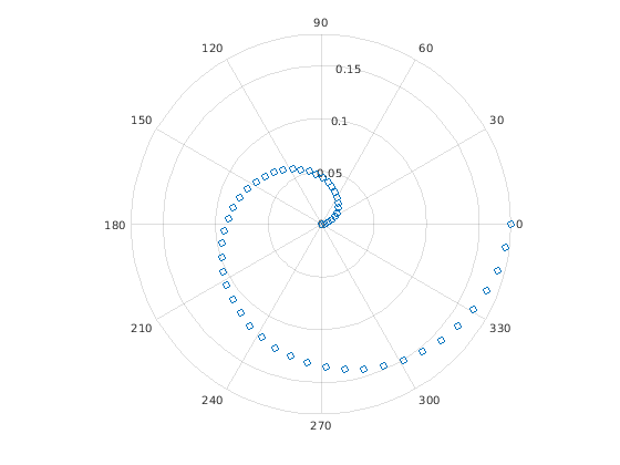 th = linspace(0,360,50); r = 0.005*th/10; th_radians = deg2rad(th); polarscatter(th_radians,r)