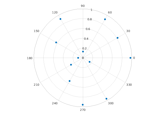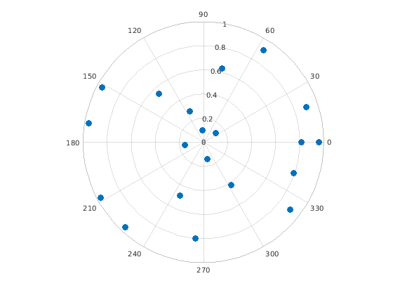 | Один набор точек | Задайте polarscatter([0 pi/4 pi/2],[1; 2; 3]) |