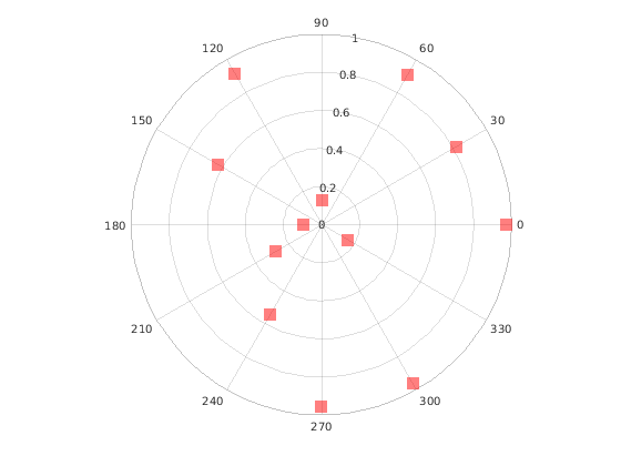polarscatter(___, изменяет внешний вид графика рассеивания с помощью одного или нескольких аргументов пары "имя-значение". Например, можно использовать полупрозрачные маркеры путем определения Name,Value)'FaceAlpha' и скалярное значение между 0 и 1.