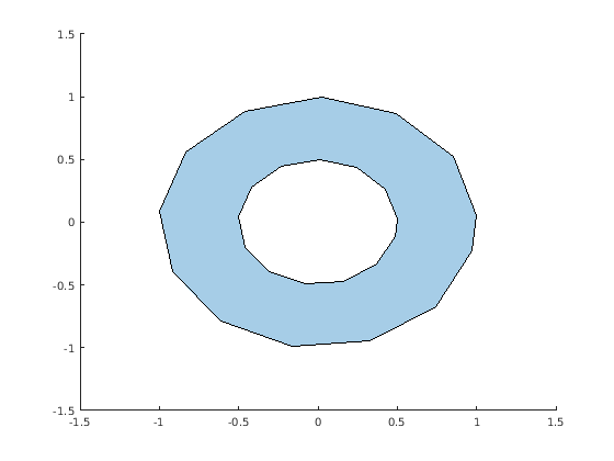 pgon = polyshape( создает P)polyshape от 2D вершин, заданных в N-by-2 матричный P, где N является количеством вершин. Первый столбец P задает x - координаты, и второй столбец задает y- координаты.
