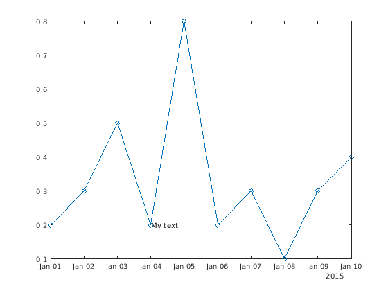 Создайте график с датами вдоль оси X. Добавьте текстовое описание в четвертую точку данных и возвратите текстовый объект.