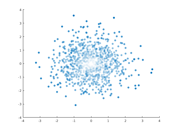 Можно варьироваться прозрачность рассеянных точек путем установки AlphaData свойство к вектору из различных значений непрозрачности. Гарантировать график рассеивания использует AlphaData значения, набор MarkerFaceAlpha свойство к 'flat'.