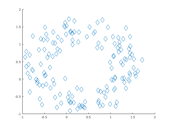 Создайте векторы x и y как синус и значения косинуса со случайным шумом. Затем создайте график рассеивания и используйте ромбовидные маркеры с областью 140 точек, в квадрате.