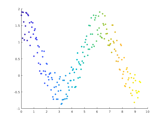 x = linspace(0,3*pi,200); y = cos(x) + rand(1,200); c = linspace(1,10,length(x)); scatter(x,y,[],c)