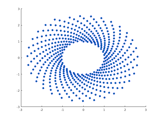 theta = linspace(0,1,500); x = exp(theta).*sin(100*theta); y = exp(theta).*cos(100*theta); s = scatter(x,y);