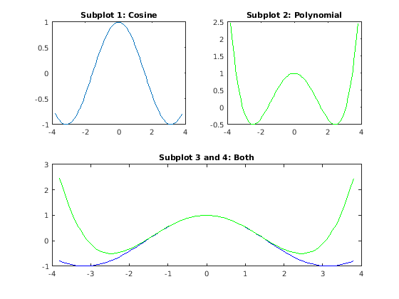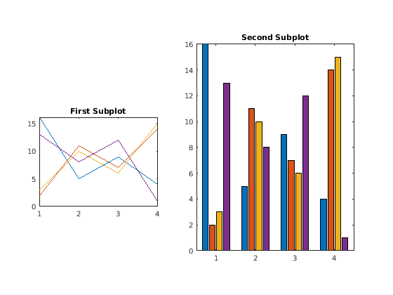 subplot( создает оси в пользовательском положении, заданном 'Position',pos)pos. Используйте эту опцию, чтобы расположить подграфик, который не выравнивается с положениями сетки. Задайте pos как четырехэлементный вектор из формы [left bottom width height]. Если новые оси перекрывают существующие оси, то новые оси заменяют существующие оси.
