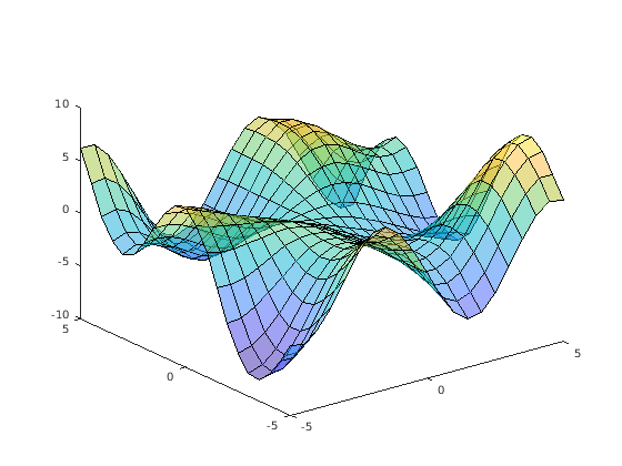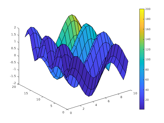 [X,Y] = meshgrid(1:0.5:10,1:20); Z = sin(X) + cos(Y); C = X.*Y; surface(X,Y,Z,C) colorbar view(3)