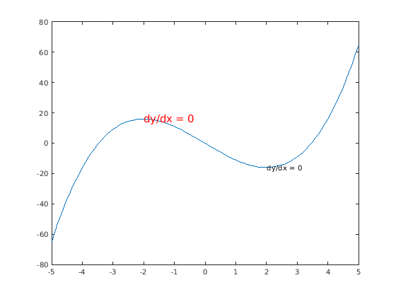 t = text([-2 2],[16 -16],'dy/dx = 0')