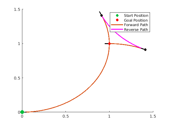 Figure contains an axes. The axes contains 13 objects of type line, scatter. These objects represent Forward Path, Reverse Path, Start Position, Goal Position.