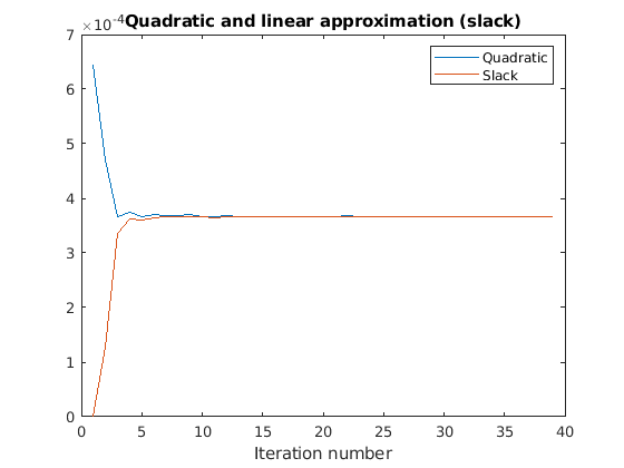 plot(history) legend('Quadratic','Slack') xlabel('Iteration number') title('Quadratic and linear approximation (slack)')