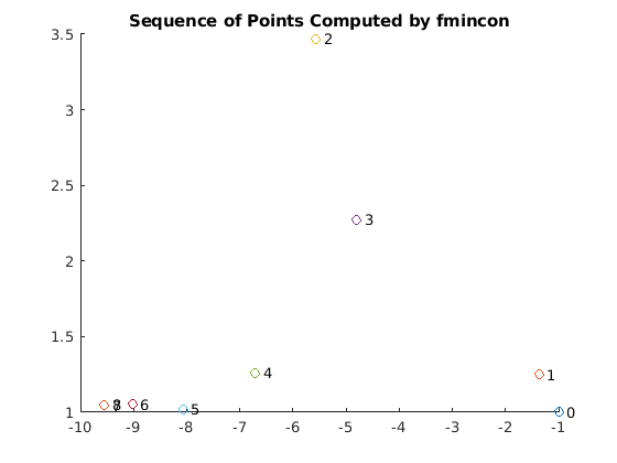 Выходная функция создает график точек, оцененных fmincon. Каждая точка помечена ее номером итерации. Оптимальная точка происходит в восьмой итерации. Последние две точки в последовательности так близки, что они перекрываются.