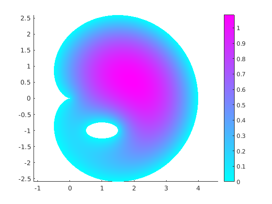 Пример решает уравнение Пуассона с нулем граничные условия Дирихле на всех контурах. Геометрия является кардиоидой с эллиптическим отверстием, которое имеет центр в (1,-1) и переменные полуоси. Чтобы настроить и решить модель PDE с этой геометрией, используйте вложенную функцию. Здесь, родительская функция принимает длины полуосей, rr и ss, как входные параметры. Причина вложить cardioidWithEllipseGeom в cardioidWithEllipseModel тот, вложенные функции совместно используют рабочую область своих родительских функций. Поэтому cardioidWithEllipseGeom функция может получить доступ к значениям rr и ss то, что вы передаете cardioidWithEllipseModel.