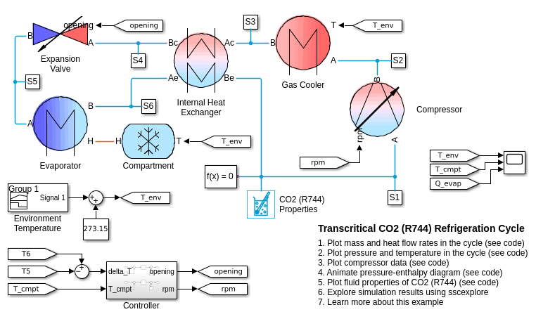 Этот пример демонстрирует цикл охлаждения сжатия пара, в котором фрагмент высокого давления цикла действует в сверхкритической жидкой области. Хладагент является углекислым газом (CO2), также названный R744 в этом приложении.