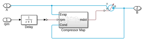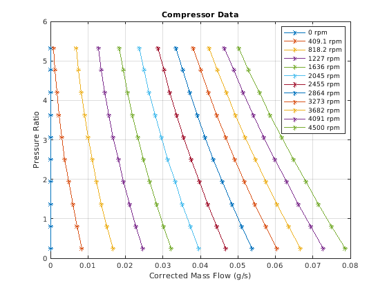 Этот график показывает давление компрессора по сравнению с кривыми потока на различных скоростях вала. Вращающийся вал не моделируется здесь; контроллер непосредственно устанавливает скорость вала производить необходимую скорость потока жидкости.