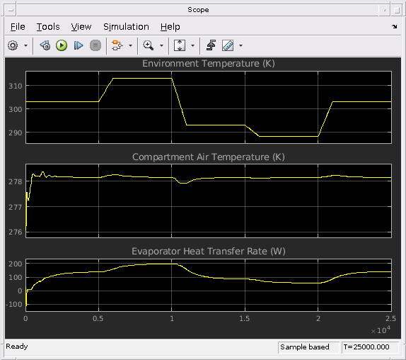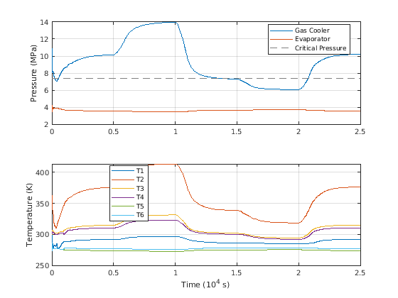 Этот график показывает давление и температуру в различных точках в цикле. Давление испарителя в сохраненном на уровне приблизительно 3,5 МПа, и газовое более холодное давление - номинально приблизительно 10 МПа, который является выше CO2 (R744) критическим давлением 7,4 МПа. Следовательно, это - транскритический цикл охлаждения. Газовые более холодные скачки давления в ответ на температуру изменяющей среды. При более низких температурах среды газовое более холодное давление может спасть до субкритических давлений.