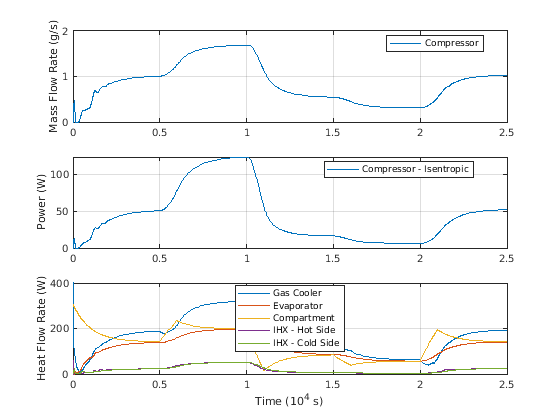Этот график показывает массовый расход жидкости, изэнтропическую входную мощность компрессора и уровни теплового потока в цикле. Газовые уровни теплового потока Вентилятора и Испарителя представляют отклонение тепла и поглощение тепла цикла, в то время как уровни теплового потока IHX являются теплопередачами в цикле внутренним теплообменником.