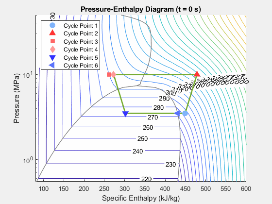 Этот рисунок показывает эволюцию жидких состояний в транскритическом цикле охлаждения в зависимости от времени. 6 точек в цикле являются входом компрессора, конденсаторным входом, внутренний теплообменник горячий вход стороны, вход клапана расширения, вход испарителя и внутренний вход стороны холода теплообменника, которые измеряются датчиками S1 к S6 в модели. Они измерения строят на схеме энтальпии давления. Контуры являются изотермами CO2 (R744).