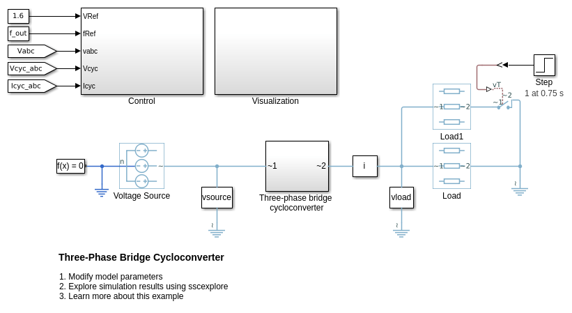 Чтобы преобразовать трехфазный сигнал непосредственно от более высокой частоты до более низкой частоты, используйте этот блок с трехфазным мостом cycloconverter. Отошлите к Три-Фэз-Бридж Cycloconverter для примера такого преобразования.