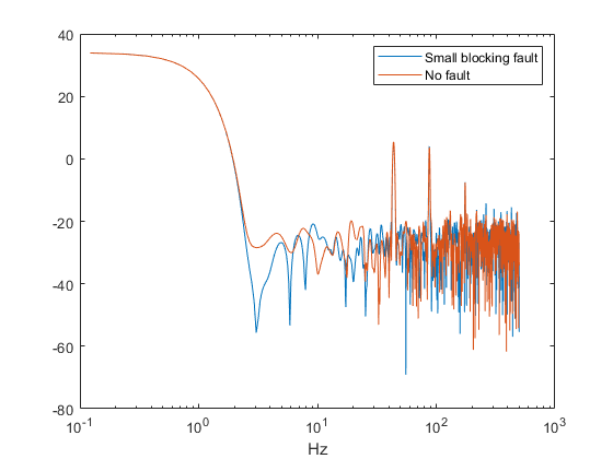 % Look for the member that was incorrectly predicted, and % compute its power spectrum idx = ... data.BlockingFault == fData.BlockingFault(1) & ... data.LeakFault == fData.LeakFault(1) & ... data.BearingFault == fData.BearingFault(1); flow1 = data(idx,1); flow1 = flow1.qOut_meas{1}; [flow1P,flow1F] = pspectrum(flow1); % Look for a member that does not have any faults idx = ... data.BlockingFault == 0.8 & ... data.LeakFault == 1e-9 & ... data.BearingFault == 0; flow2 = data(idx,1); flow2 = flow2.qOut_meas{1}; [flow2P,flow2F] = pspectrum(flow2); % Plot the power spectra semilogx(... flow1F,pow2db(flow1P),... flow2F,pow2db(flow2P)); xlabel('Hz') legend('Small blocking fault','No fault')