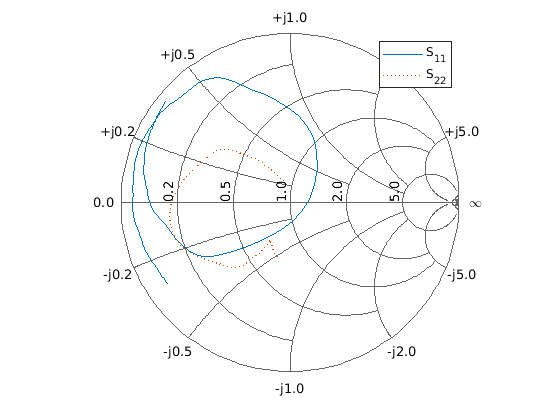 figure lineseries1 = smith(SecondCkt,'S11','S22'); lineseries1(1).LineStyle = '-'; lineseries1(1).LineWidth = 1; lineseries1(2).LineStyle = ':'; lineseries1(2).LineWidth = 1;