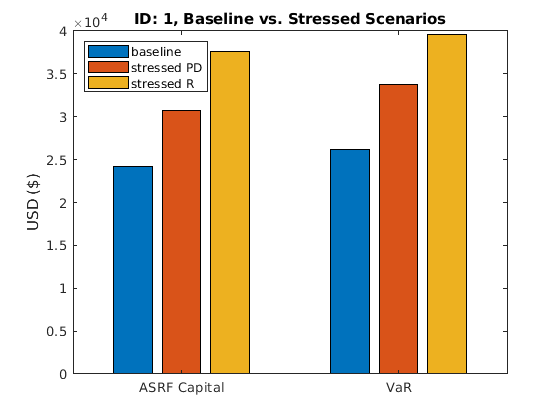% Counterparty ID id = 1; % Set the default asset correlation to 0.2 as the baseline. R = 0.2; % Compute the baseline capital and VaR. [capital0, var0] = asrf(portfolio.PD(id),portfolio.LGD(id),R,'EAD',portfolio.EAD(id)); % Stressed PD by 50% [capital1, var1] = asrf(portfolio.PD(id) * 1.5,portfolio.LGD(id),R,'EAD',portfolio.EAD(id)); % Stressed Correlation by 50% [capital2, var2] = asrf(portfolio.PD(id),portfolio.LGD(id),R * 1.5,'EAD',portfolio.EAD(id)); c = categorical({'ASRF Capital','VaR'}); bar(c,[capital0 capital1 capital2; var0 var1 var2]); legend({'baseline','stressed PD','stressed R'},'Location','northwest') title(sprintf('ID: %d, Baseline vs. Stressed Scenarios',id)); ylabel('USD ($)');