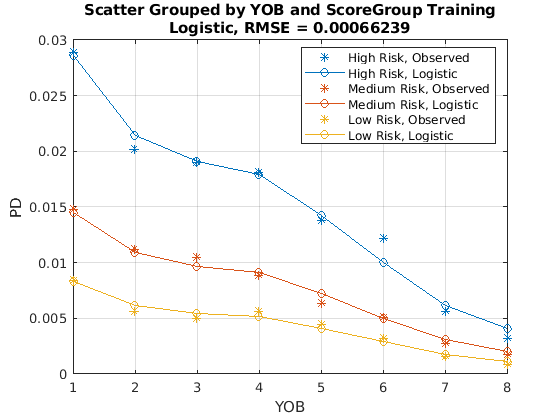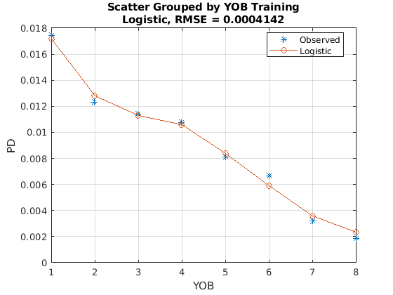 pdModel = fitLifetimePDModel(data(TrainDataInd,:),"Logistic",... 'AgeVar','YOB',... 'IDVar','ID',... 'LoanVars','ScoreGroup',... 'MacroVars',{'GDP','Market'},... 'ResponseVar','Default'); disp(pdModel)
