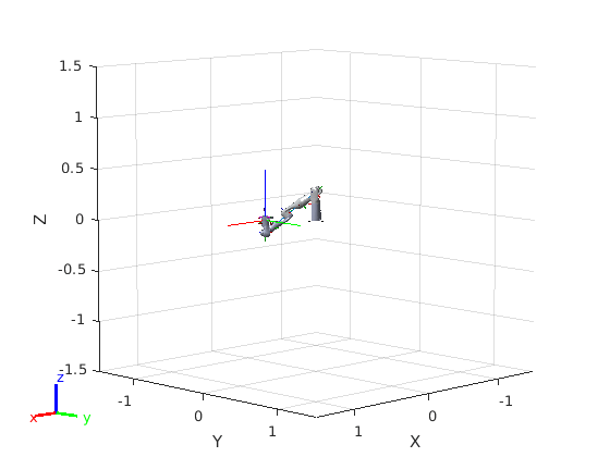 figure; show(robot,qConfig); hold all plotTransforms(tform2trvec(targetPose),tform2quat(targetPose),"FrameSize",0.5);