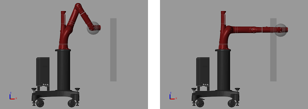 Следующие рисунки показывают визуализацию робота начальной настройки и целевой настройки, связанной с местоположением плоского объекта. Плоский объект помещается так, чтобы робот столкнулся к нему во время отслеживания траектории.