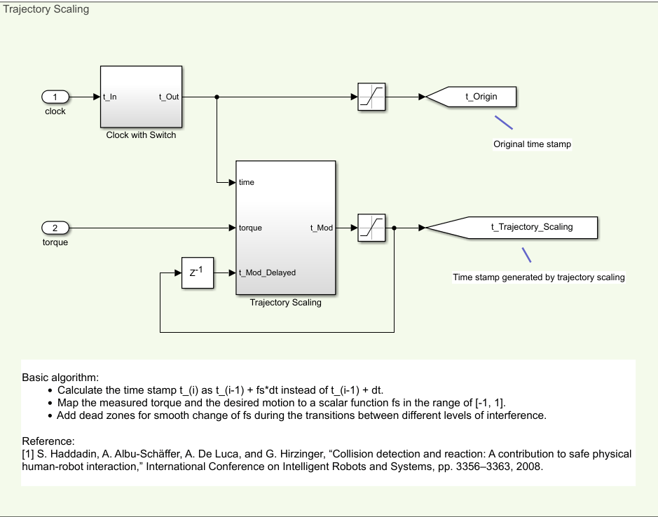 Масштабирование траектории является основным блоком, развернутым для безопасного отслеживания траектории в этом примере. На каждом временном шаге , исходная метка времени вычисляется как . Однако, когда робот сталкивается с непредвиденным объектом, увеличивающийся крутящий момент и отклонение от запланированной траектории могут быть разрушительными и для робота и для объекта. Основная идея масштабирования траектории состоит в том, чтобы вычислить метку времени как путем представления , который является функцией желаемого движения и измеренного крутящего момента . Функция контролирует скорость движения робота и определяется на основе интерференции, которую чувствует робот. Если измеренные крутящие моменты больше, чем ожидалось, уменьшен, чтобы заставить робота замедлиться или даже переместиться назад, пока желаемые крутящие моменты не достигаются. Эти значения окажите следующие влияния на движение робота: