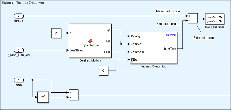 В блоке Trajectory Scaling это требуется, чтобы оценивать внешний крутящий момент вычислять , где измеренный крутящий момент из модели Simscape, и ожидаемый крутящий момент желаемого движения на предыдущей метке времени. В разделе External Torque Observer модели, Обратный блок Dynamics вычисляет ожидаемый крутящий момент, который вычтен из крутящего момента меры. Ожидаемый крутящий момент: .