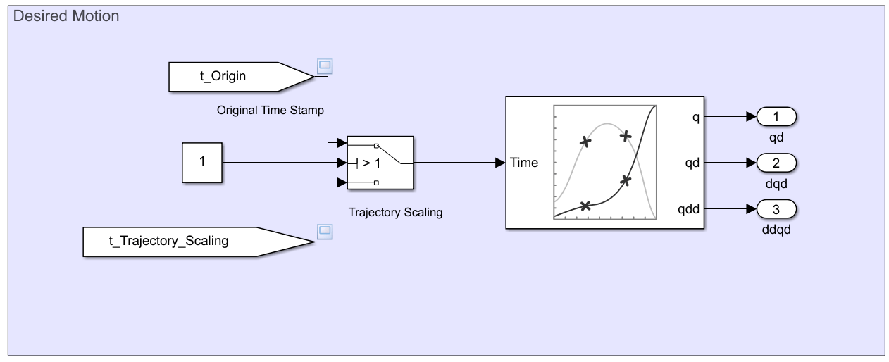 В области Desired Motion выход алгоритма масштабирования траектории питается как вход блок Polynomial Trajectory. Этот блок вычисляет quintic полиномиальную траекторию, учитывая известные значения q0 и q1 и их граничных условий - нулевая скорость и ускорение. Это выводит положение, скорость и ускорение: , и , которые питаются Вычисленную Подсистему контроллера Крутящего момента.