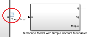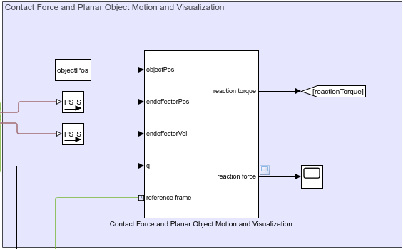 Модель Робота Simscape Multibody импортируется из того же .urdf файл с помощью smimport, где набор приводов крутящего момента и датчиков для объединенного крутящего момента, объединенного положения и скорости добавляется. Блок механизма контакта как показано ниже добавляется, чтобы симулировать силу реакции между исполнительным элементом конца и препятствием как сфера и плоскость, где простая линейная модель пружинного демпфера используется.