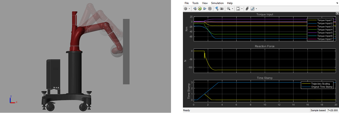 На каждом временном шаге, если переключатель масштабирования траектории включен, модифицированная метка времени используется для оценки желаемого объединенного положения, скорости и ускорения. Затем вычисленный контроллер крутящего момента использует блоки манипулятора, сопоставленные с RigidBodyTree модель, чтобы отследить желаемое движение. Выведенный вход управления подан в модель Sawyer в Simscape Multibody (где плоский объект для взаимодействия с роботом включен).