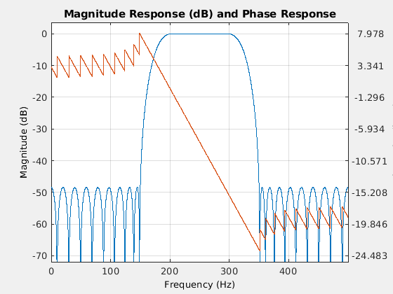 N = 50; Fstop1 = 150; Fstop2 = 350; Fpass1 = 200; Fpass2 = 300; Fs = 1e3; bpFilt = designfilt('bandpassfir','FilterOrder',N, ... 'StopbandFrequency1',Fstop1,... 'StopbandFrequency2',Fstop2,... 'PassbandFrequency1',Fpass1,... 'PassbandFrequency2',Fpass2,... 'SampleRate',Fs); fvtool(bpFilt,'Analysis','freq')
