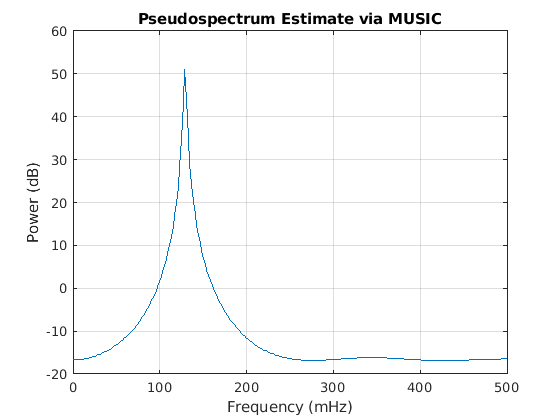 pmusic(___) без выходных аргументов строит псевдоспектр в окне текущей фигуры.