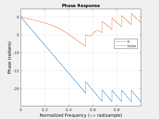 Figure Filter Visualization Tool - Phase Response contains an axes and other objects of type uitoolbar, uimenu. The axes with title Phase Response contains 2 objects of type line. These objects represent h, hmin.