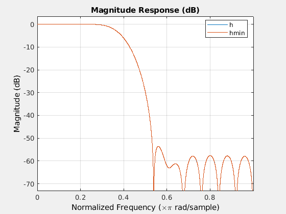 Figure Filter Visualization Tool - Magnitude Response (dB) contains an axes and other objects of type uitoolbar, uimenu. The axes with title Magnitude Response (dB) contains 2 objects of type line. These objects represent h, hmin.