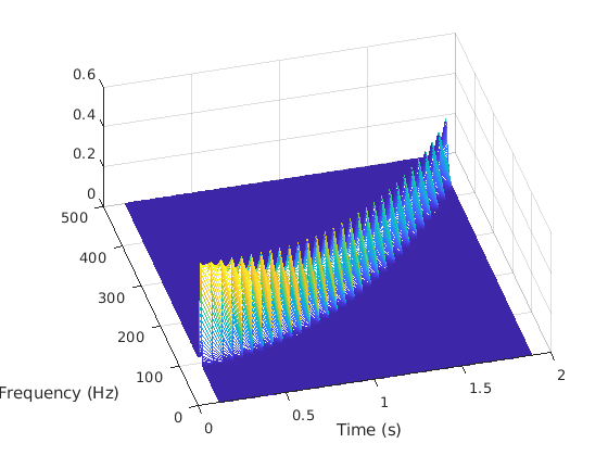 [p,f,t] = pspectrum(x2,fs,'spectrogram'); waterfall(f,t,p'); xlabel('Frequency (Hz)') ylabel('Time (seconds)') wtf = gca; wtf.XDir = 'reverse'; view([30 45])