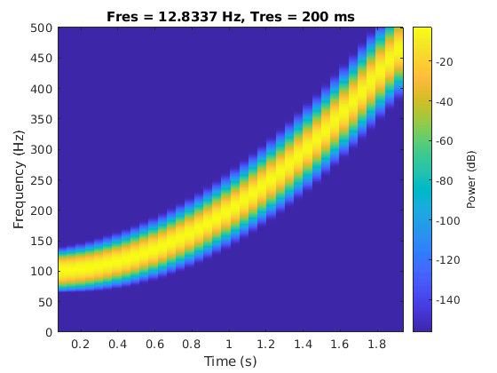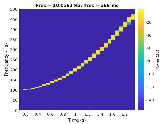 pspectrum(S,'spectrogram', ... 'TimeResolution',0.5,'OverlapPercent',0,'Leakage',0.85)