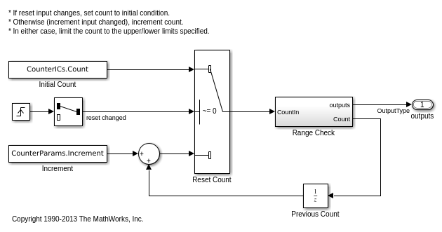 Различные блоки в подсистеме "Проверки диапазона" используют значения нижних и верхних пределов (CounterParams.LowerLimit и CounterParams.UpperLimit).