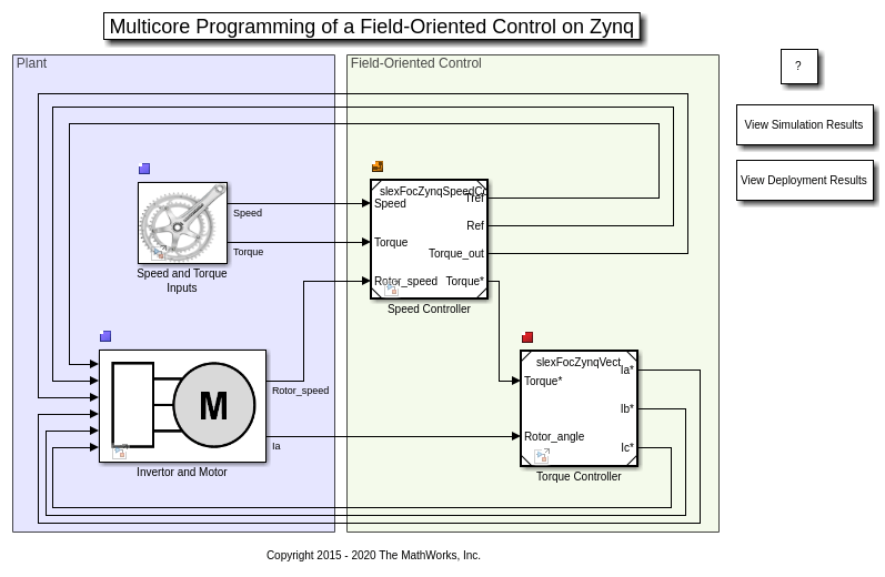 Модель в качестве примера состоит из двух областей Simulink. В области Permanent Magnet Synchronous Machine существует два блока: блок "Speed and Torque Inputs", который предоставляет ссылочные входные параметры системе с обратной связью и блок "Invertor and Motor", который является объектом, которым мы стремимся управлять в этом примере. Блок "Invertor and Motor" также содержит периферийные устройства: осциллограф, который может использоваться для исследования результатов симуляции и отправителя UDP. Сгенерированный код для отправителя UDP ответственен за отправку данных моделирования с оценочной платы Zynq ZC702 на хост-машину. Ориентированное на поле Управление содержит контроллер скорости "Блоков контроллера" и "Контроллер крутящего момента". Чтобы загрузить модель, войти