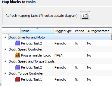 Оценочная плата имеет ARM центральный процессор Cortex-A9 и программируемая пользователем вентильная матрица (FPGA). Существует две задачи, работающие на центральном процессоре ARM. "Контроллер крутящего момента" сопоставлен с первой задачей и блоками, которые составляют объект (блок "Speed and Torque Inputs" и "Инвертор, и Двигатель") сопоставлены со второй задачей. "Контроллер скорости", который действует на высокой частоте в цикле управления, сопоставлен с FPGA. Эти настройки могут быть изменены в разделе "Tasks and Mapping" диалогового окна "Concurrent Execution".