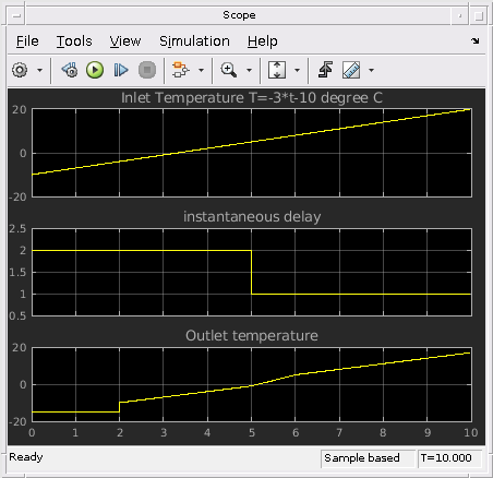 Если вы продвигаетесь через модель, осциллограф только обновляется, когда блок scope запускается. Это означает, что время, показанное в строке состояния, не может совпадать со временем модели.
