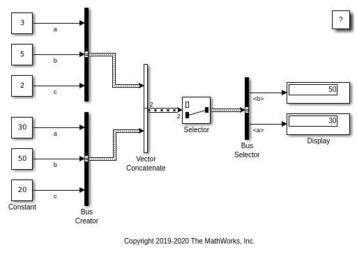 Можно использовать блок Constant, чтобы сжато представлять массив шин с элементами шины с постоянным знаком. Этот метод может сократить количество линий в модели и количество переменных, используемых моделью, особенно когда модель повторяет алгоритм с различными значениями параметров.