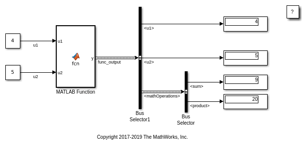 В этой модели в качестве примера блок MATLAB function включает код MATLAB, который создает структуру. Если блок MATLAB function выводит структуру, то необходимо использовать Simulink.Bus объект задать шину выход.