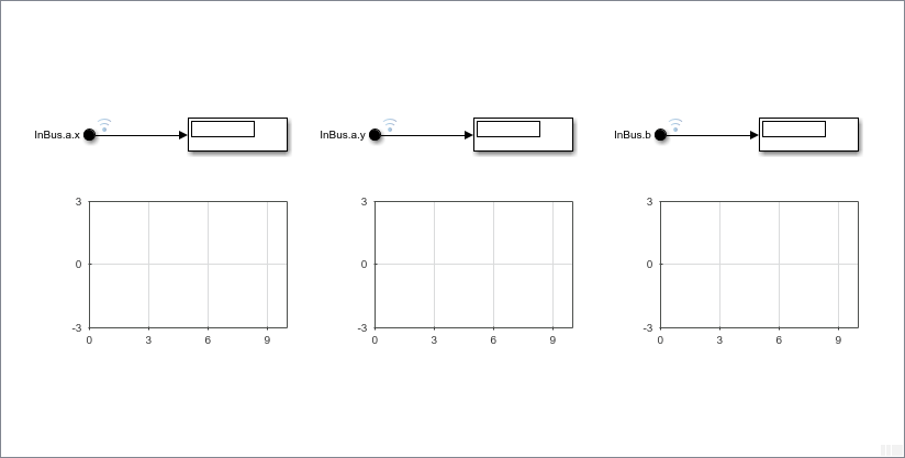 Например, отредактируйте метку для блока In Bus Element, который выбирает элемент InBus.a.y так, чтобы блок In Bus Element выбрал InBus.a.z. Структура, которая сопоставляет с InBus порт не содержит поле для z во вложенной структуре, a. Когда вы симулируете модель, не изменяя структуру, Осциллограф Инструментальной панели показывает основание для InBus.a.z.