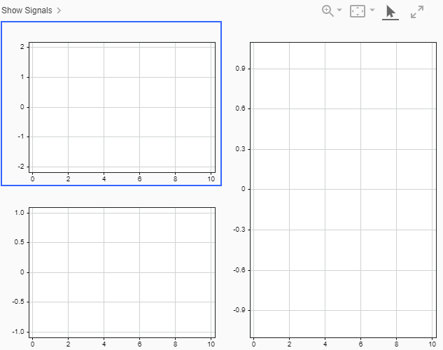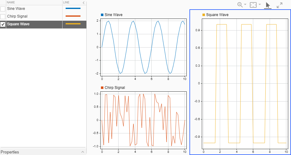 Чтобы построить сигналы в графиках временной зависимости, расширьте таблицу сигналов путем нажатия на Show Signals в верхнем левом. Установите флажок рядом с сигналом, который вы хотите построить на выбранном подграфике, обрисованном в общих чертах в синем. Например, постройте Sine Wave сигнал в первом подграфике. Затем выберите другой подграфик и постройте Chirp сигнал. Выберите итоговый подграфик и постройте Square Wave сигнал.