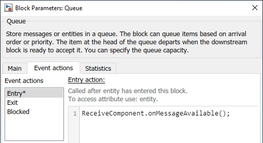 Чтобы достигнуть этого поведения, в блоке Queue, в конечном счете вкладка действия, в поле Entry, блок вызывает Функцию Simulink onMessageAvailable(). Смотрите Языки Действия События и Генерацию случайных чисел (SimEvents) для получения дополнительной информации о Действиях События.