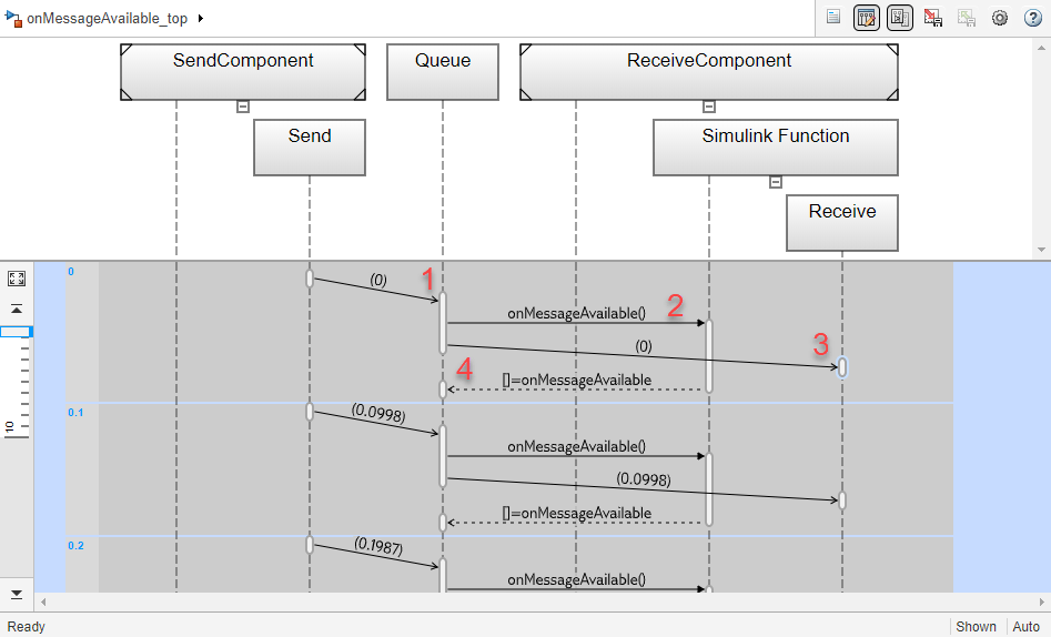 В результате сообщения, отправленные от SendComponent, инициировали выполнение в ReceiveComponent. Чтобы наблюдать это поведение, используйте блок Sequence Viewer.