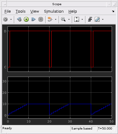 Callee график содержит два состояния, C и D. Каждый раз, когда график выполняется, выходные данные y шаг одним. C состояния первоначально активно. После одного временного шага, значения y положительно, и график берет переход, чтобы утвердить D.